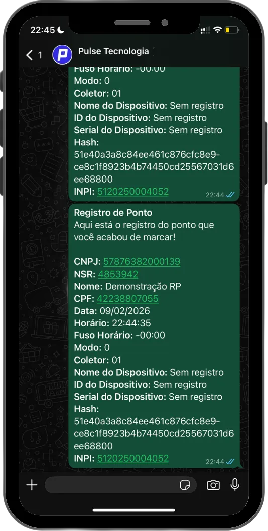 Envio automático de comprovantes de marcação de ponto pelo WhatsApp, aumentando transparência e reduzindo esquecimentos e dúvidas com colaboradores.